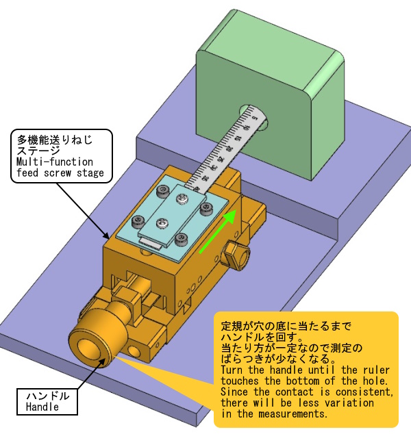 定規を多機能送りねじステージに取り付けました。ハンドルをゆっくり回して、定規が穴の底に当たった時点で回すのを止めて、穴の入口の値を読み取ります。