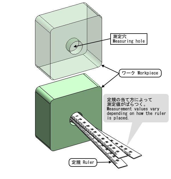 ワークにある穴の深さを測定しています。穴の底に定規を当てて、穴の入口の値を読取ります。定規の当て方が傾いたりするため測定値がばらつきます。